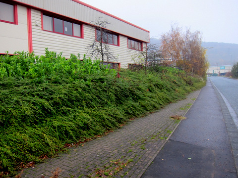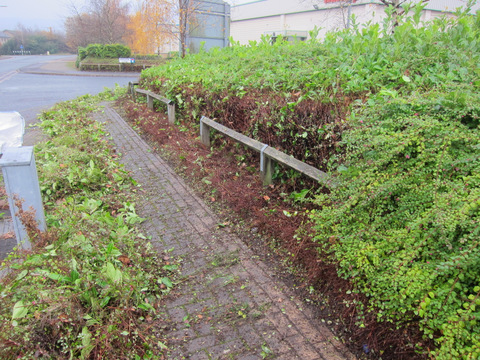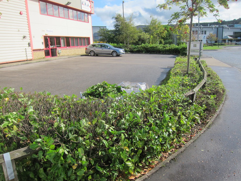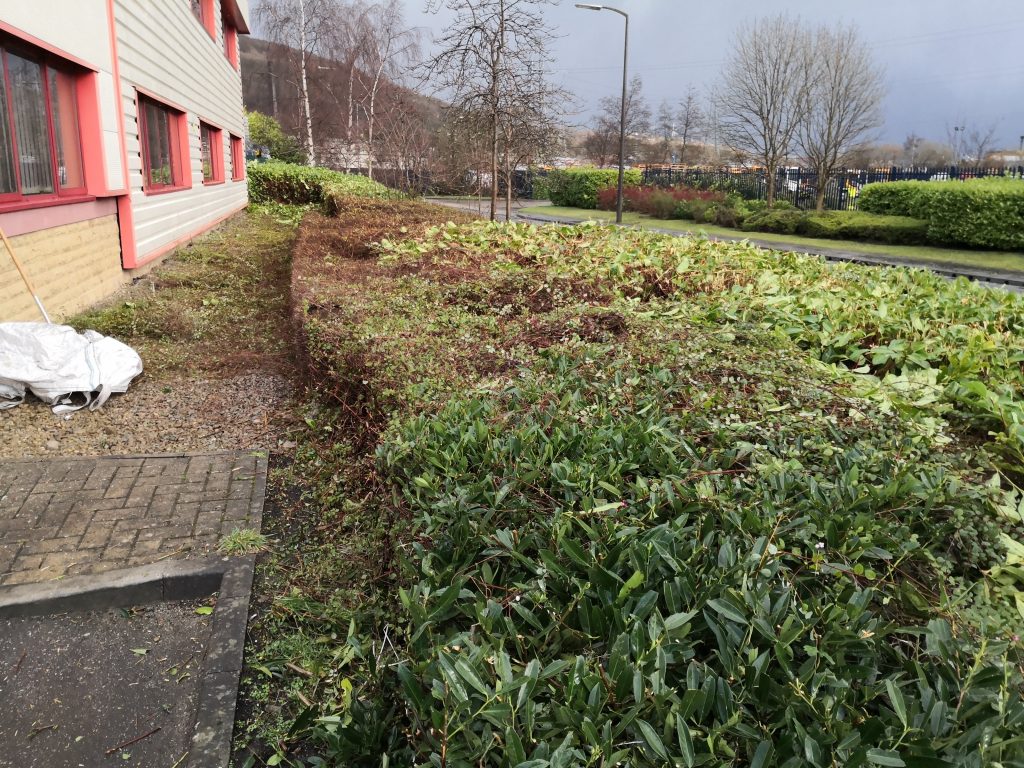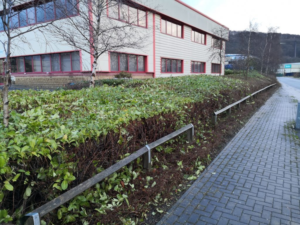 An example of a large local industrial unit that required mature shrubbery trimming back to expose a hidden fence and neaten the boundaries. Most green waste was mulched back into the beds with larger branches disposed of in the company skip. Where possible green waste is recycled and works carried out at the weekend to minimise disruption/noise nuisance.