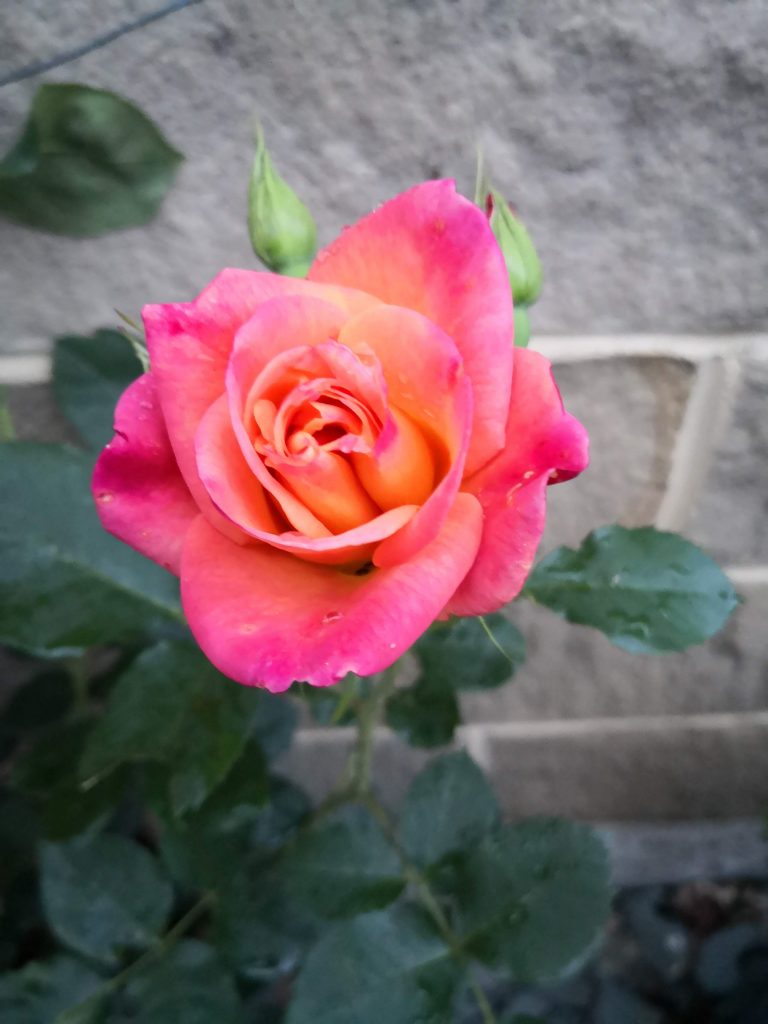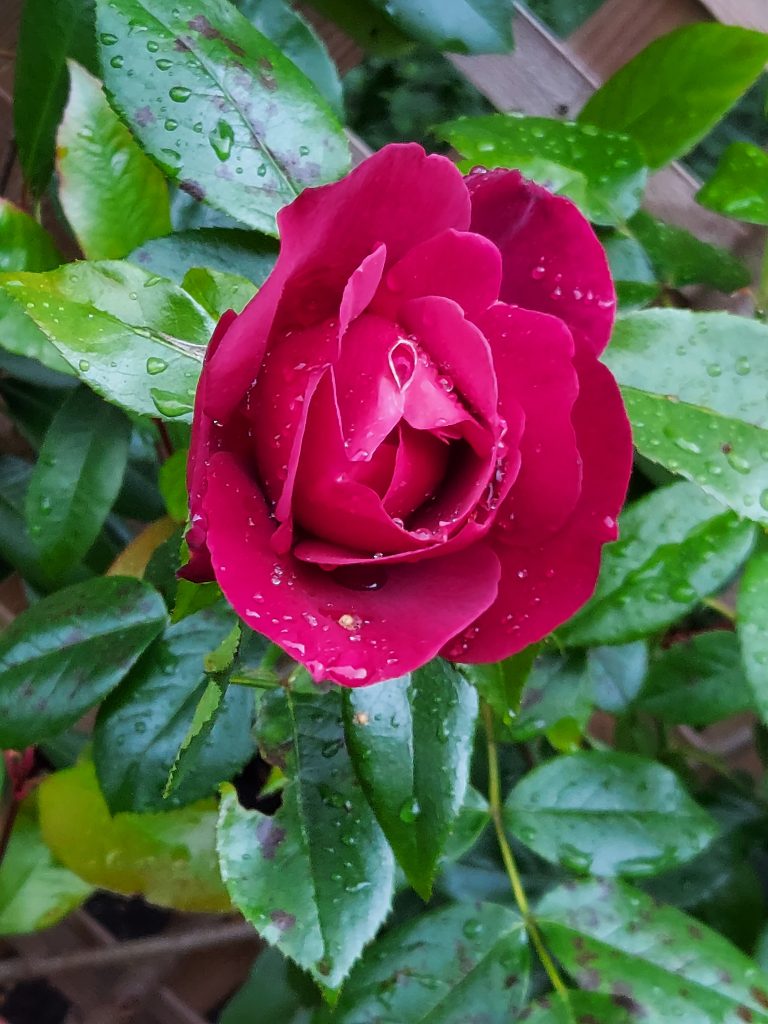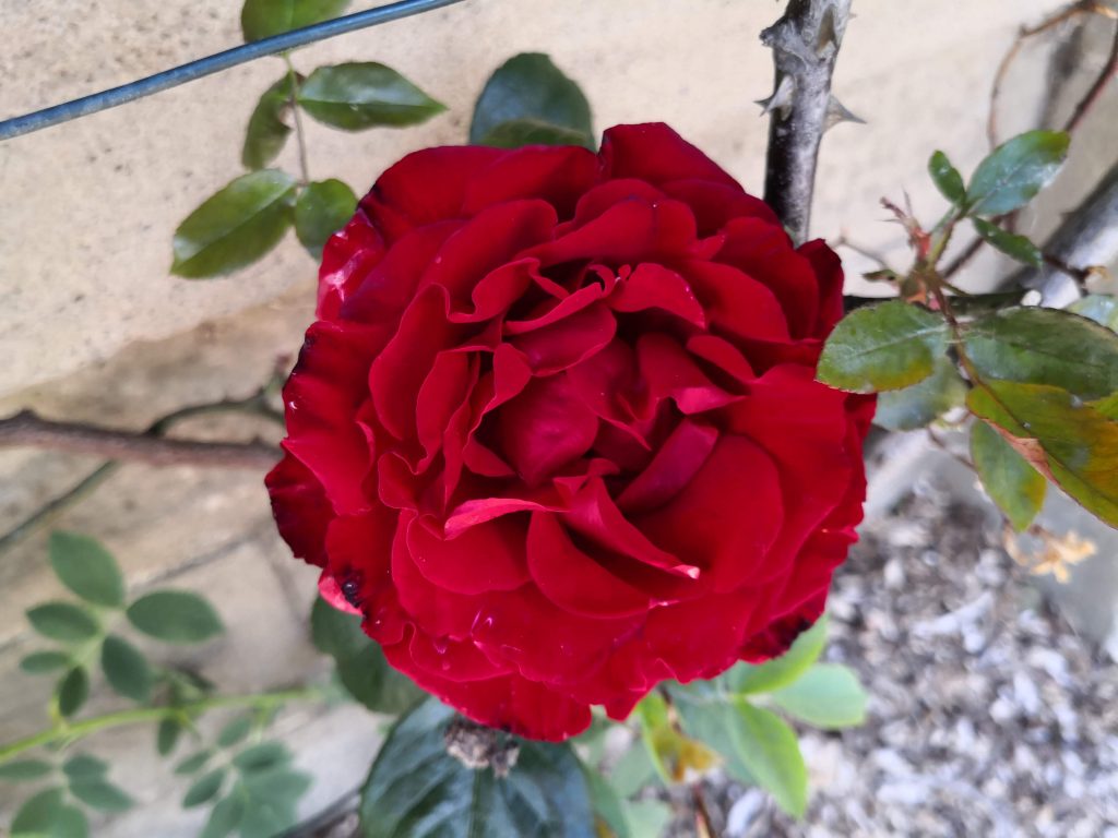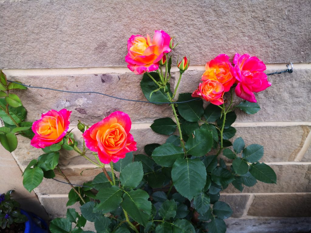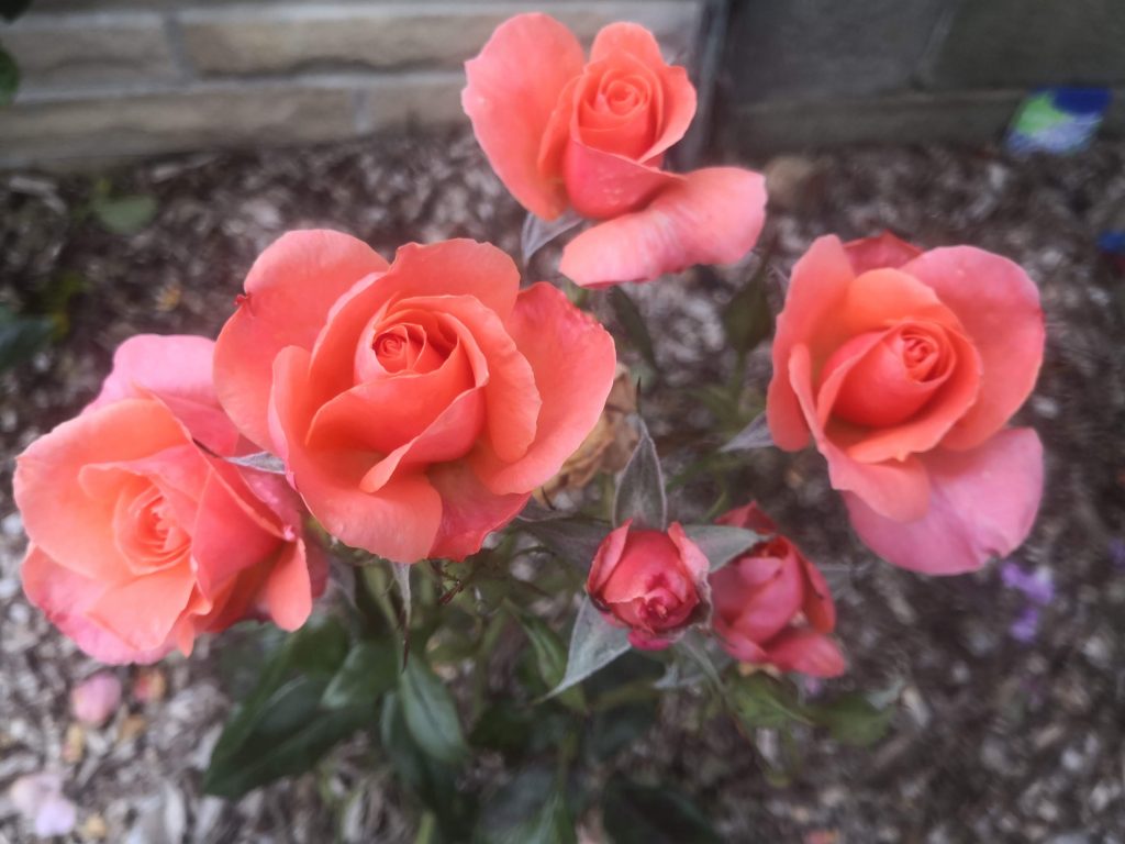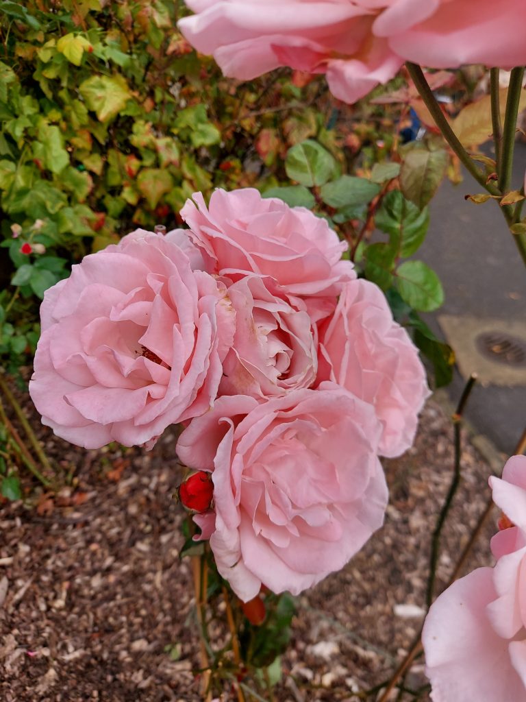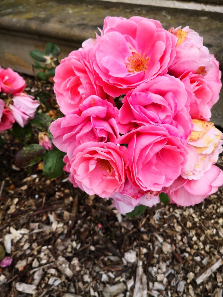 A formal rose bed created at the entrance to a Grade 1 Listed property, an exposed and windy site so all roses are staked and regularly tidied. Examples of various specimens shown below.