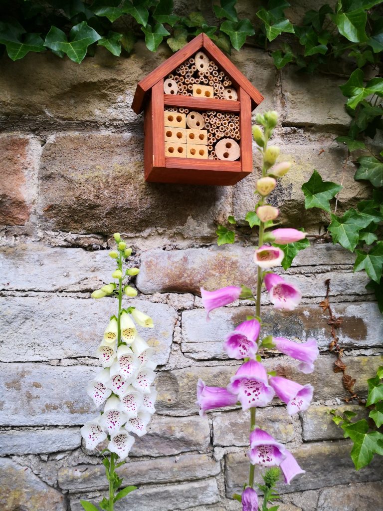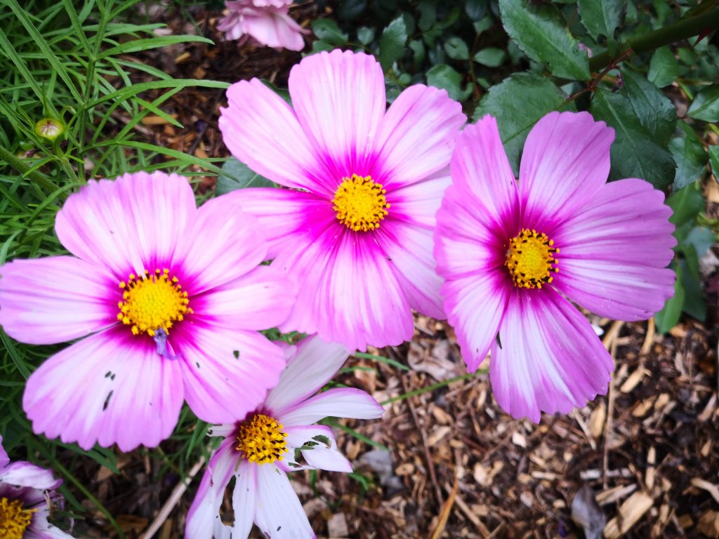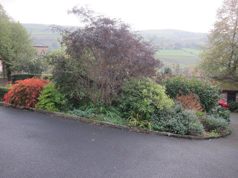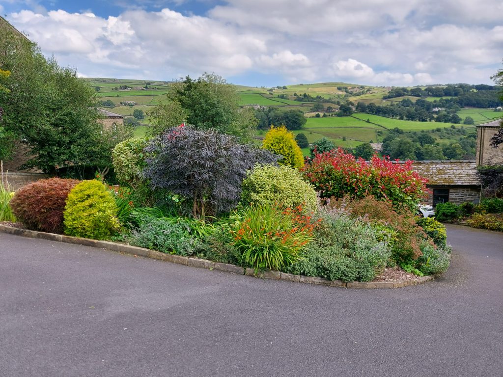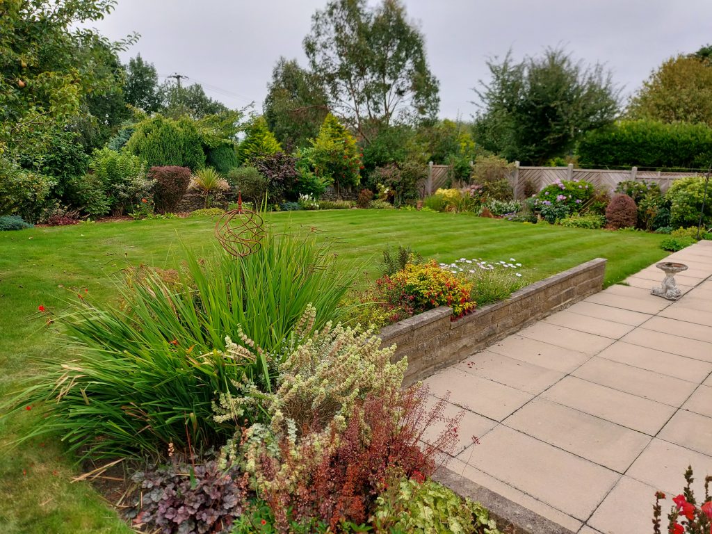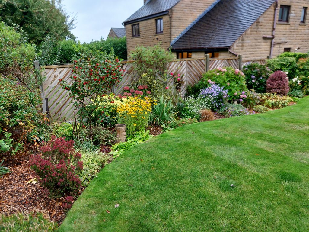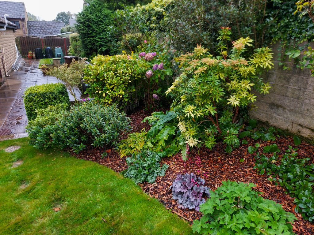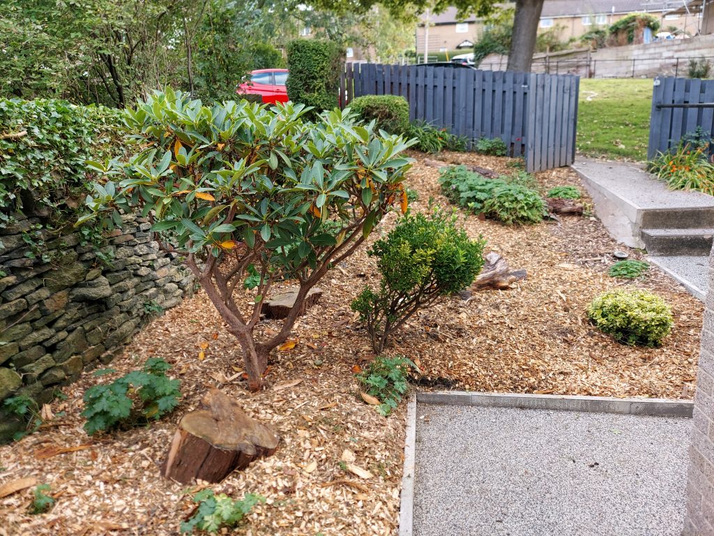 Mature gardens at a detached property near Cleckheaton showing neatly trimmed shrubs and borders and woodchip mulch added to the beds to aid moisture retention and combat weeds.
