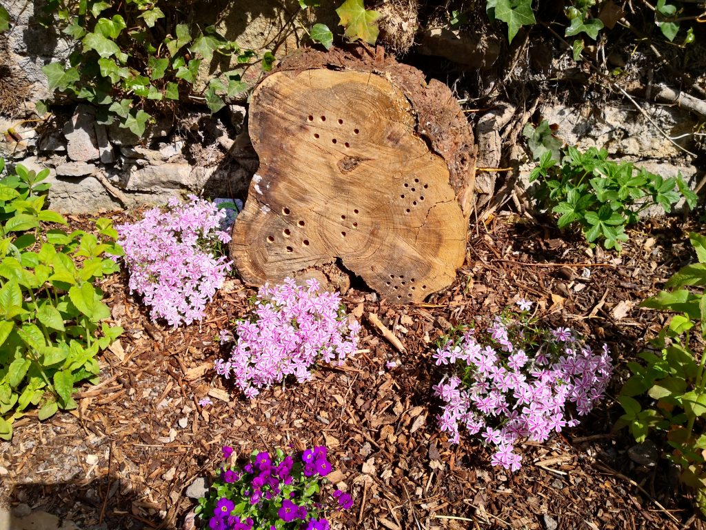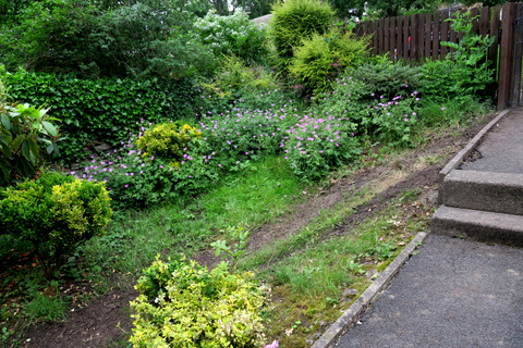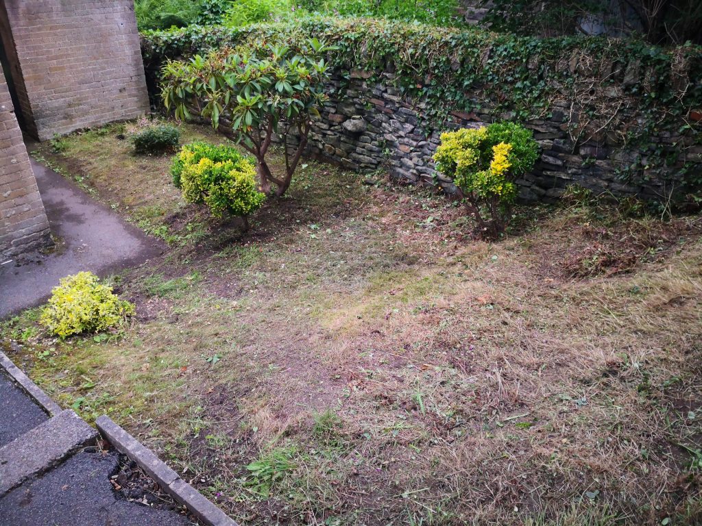 Shady front garden of a property, grass and weeds removed where possible, shrubs tidied up and log features positioned ready for planting perennials. Woodchip mulch spread to help combat weeds and give a neat appearance.