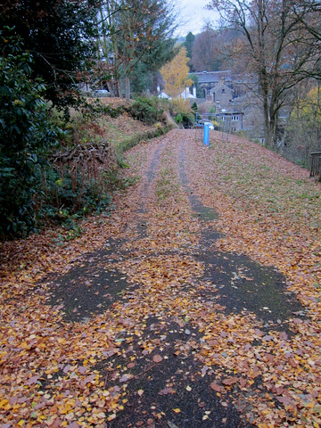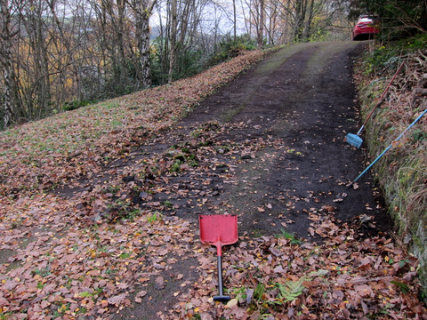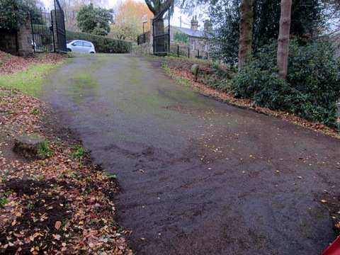 Steep woodland drive to a village property covered in moss, leaves and detritus all removed by a mixture of methods to enable safer access to property during autumn/winter weather.