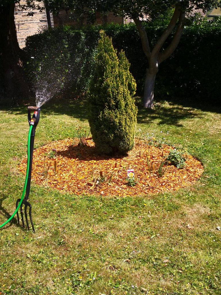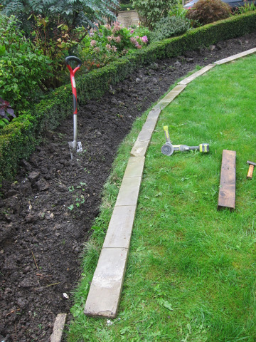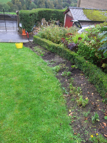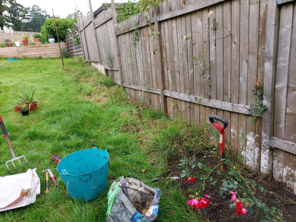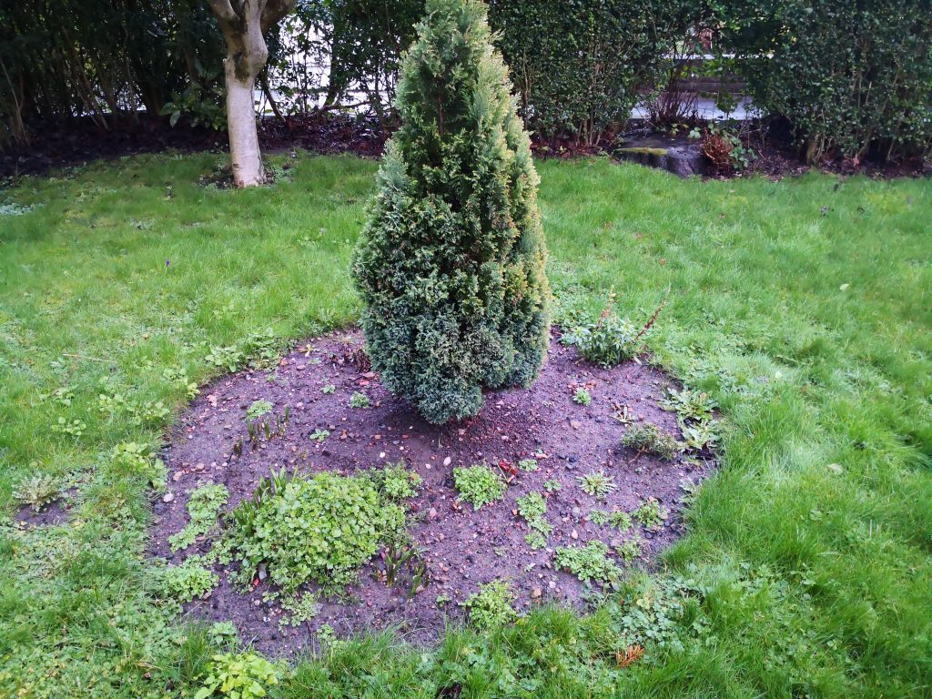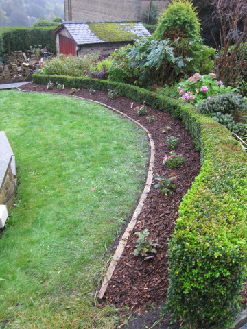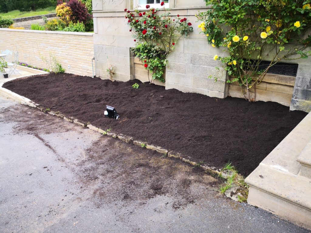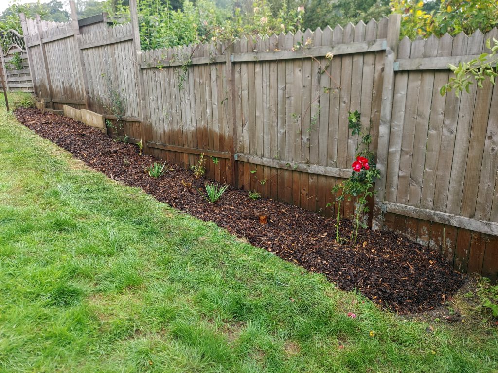 A lawn flowerbed neatened up, new roses and spring bulbs planted and a woodchip mulch applied to keep weeds down.