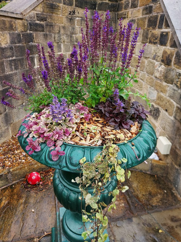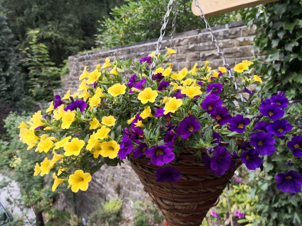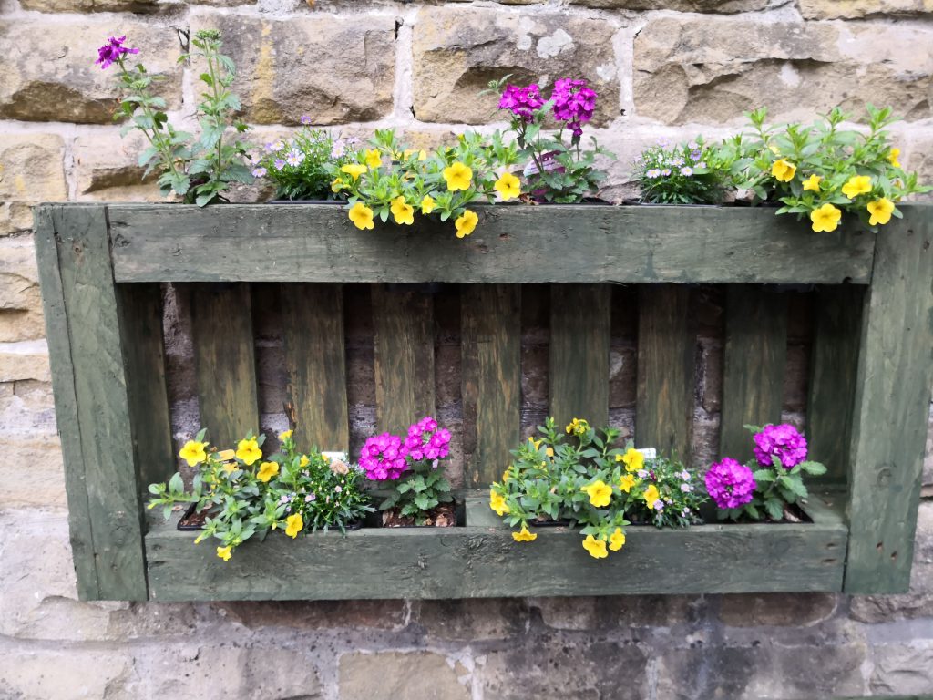 Examples of planting of baskets, planters and recycled pallet display. Purples and lemons work really well together.
