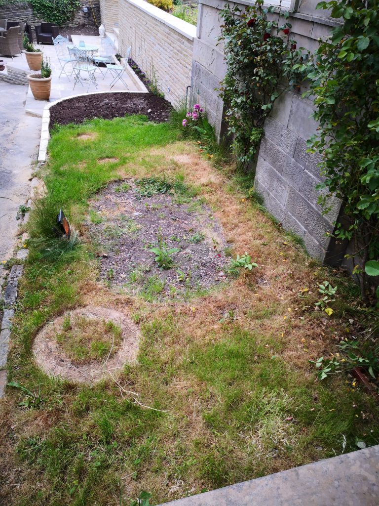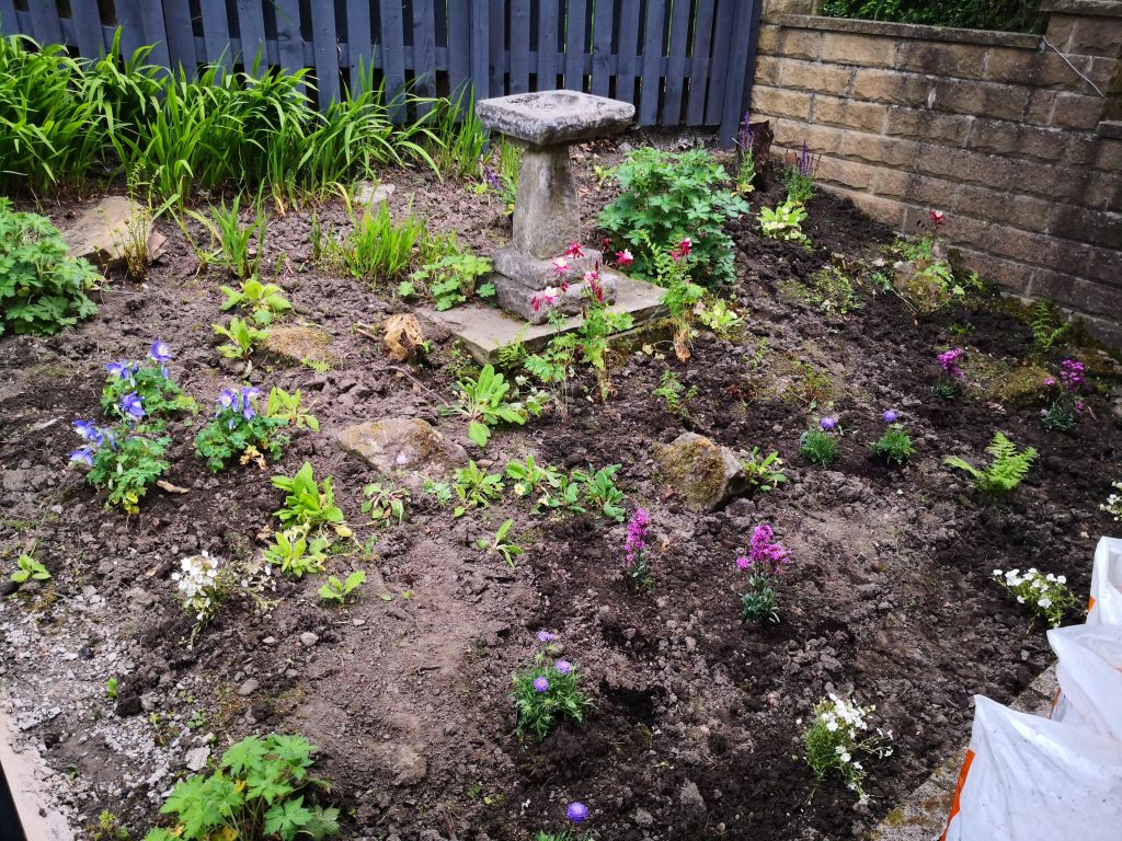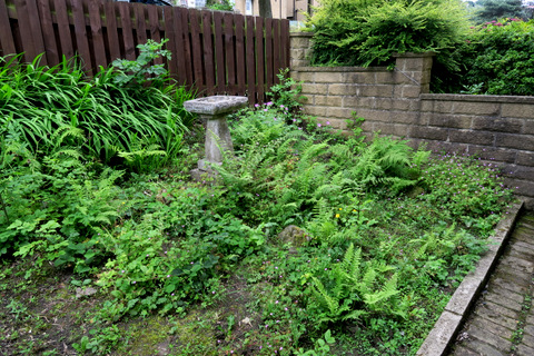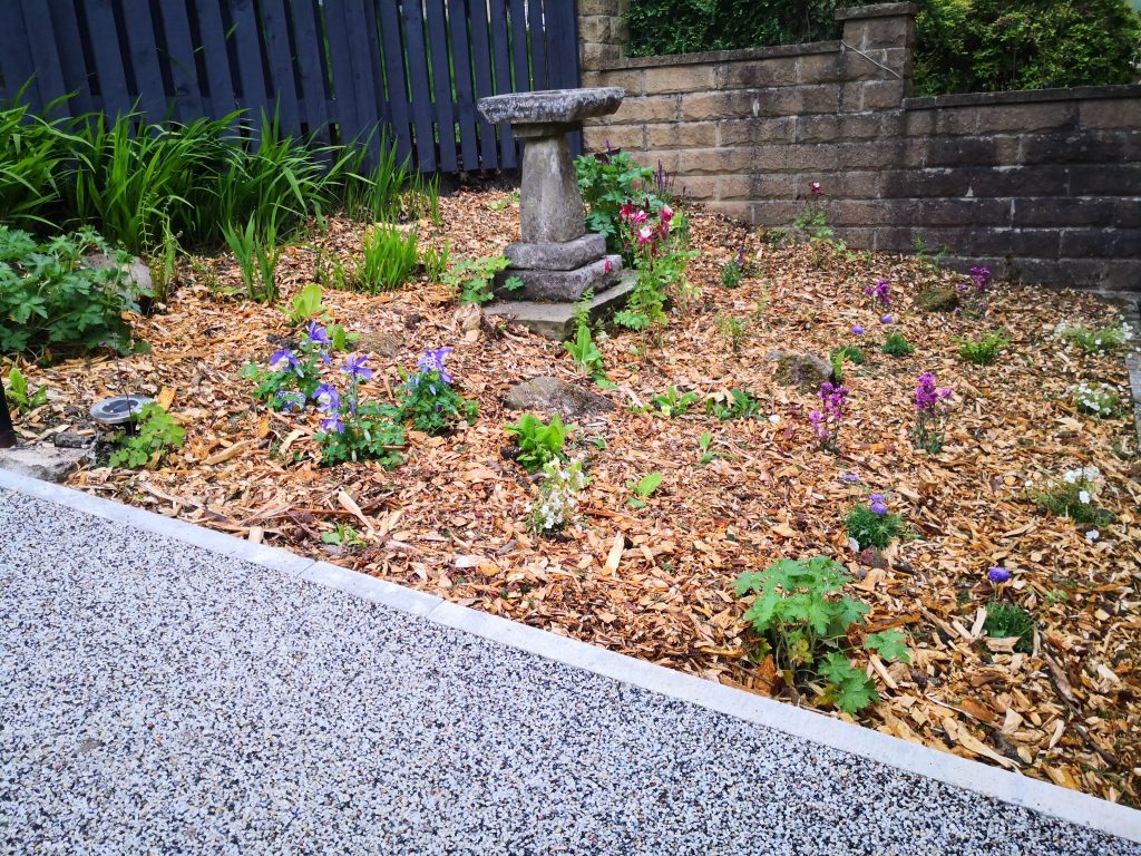 A neglected front garden tidied, new perennials planted and a woodchip mulch applied to resist weeds and retain moisture.